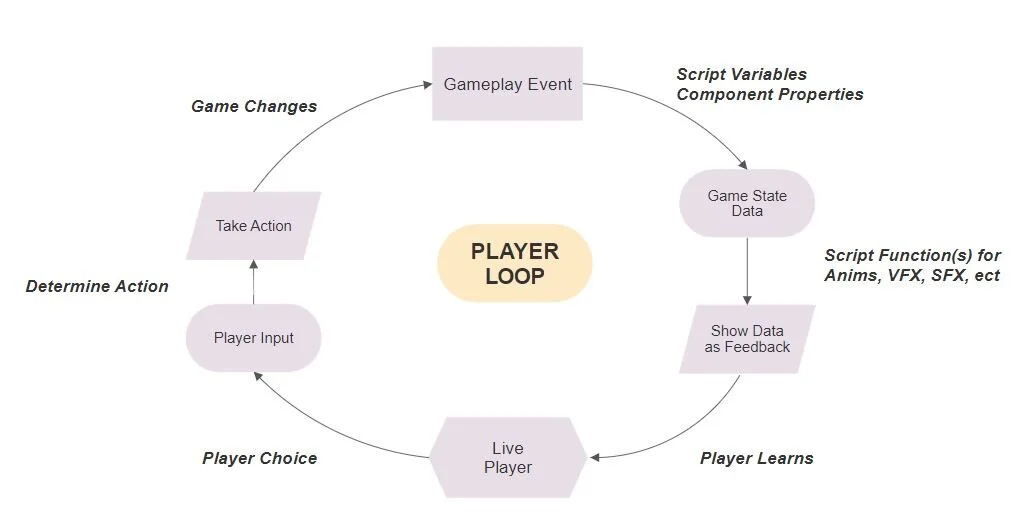 This should feel pretty familiar if you’ve made games before. Most gameplay code fits somewhere in this loop, whether it is interpreting player button presses contextually, putting feedback into the UI, or setting up events to listen for on custom objects. The overall effect should be that the player can do something, see the result, and then do another thing. There are obviously a lot of artistic and design techniques to keep players engaged that tickle our human psychology, but this is the fundamental structure of how humans use software.