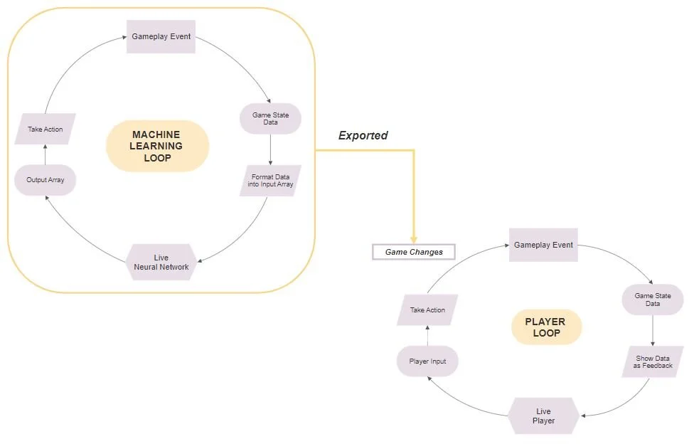 We suggest integrating these loops together, because they use so much of the same game logic as a backbone. This way the human player and the AI can influence each other, learn from each other and develop a unique play experience.