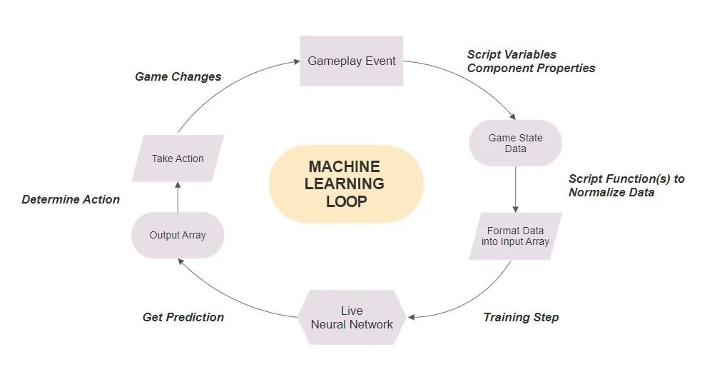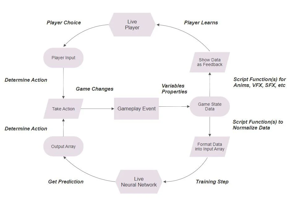 You can see, the player’s experience and the AI’s “experience” are separate from one another. The player’s actions can’t interact with the way the neural network learns, and their game experience can be good but not particularly different than current state based AI.